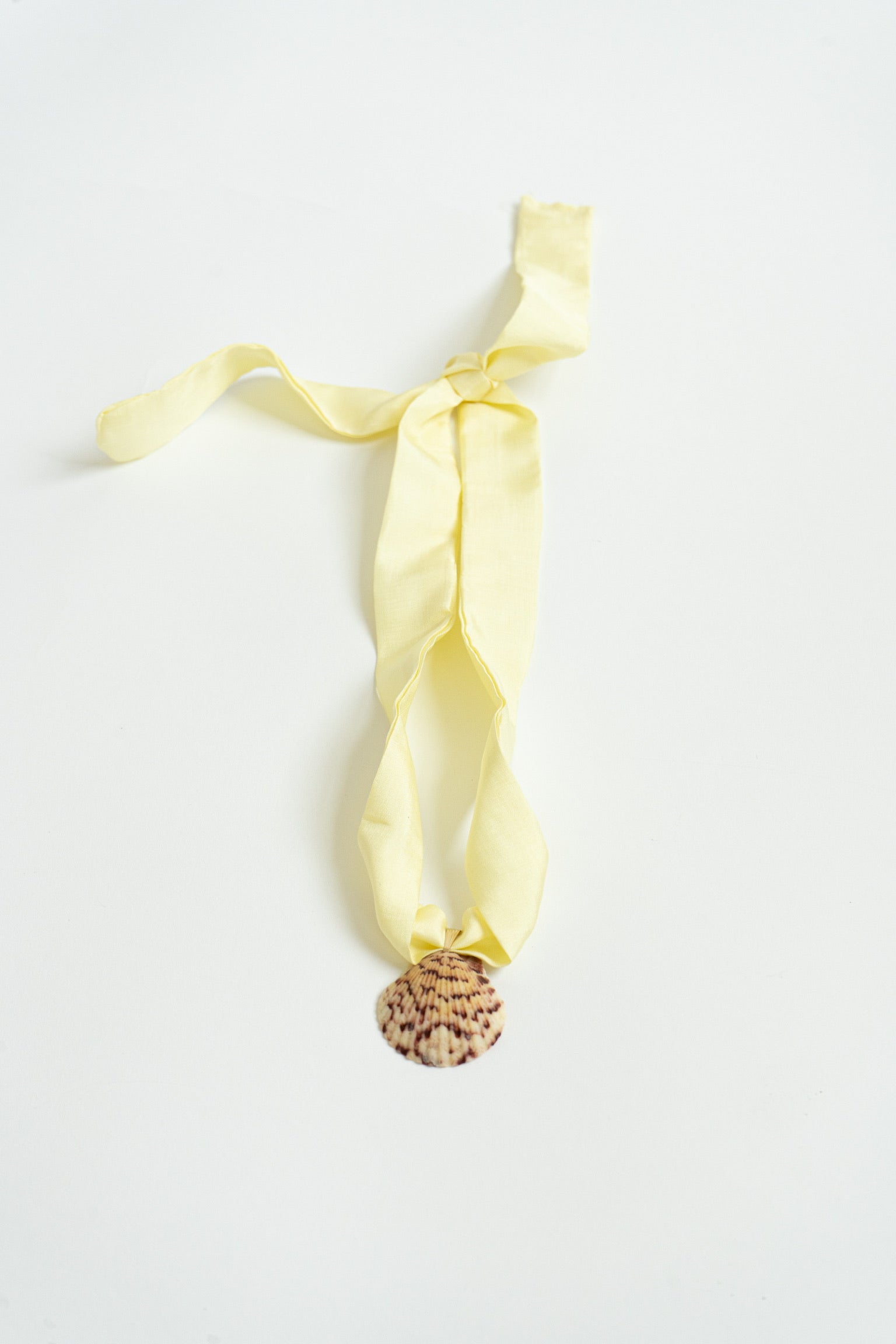 This Soleil Necklace features vintage recycled butter yellow satin fabric, hand-sewn to drape gracefully with a luxurious, soft, and lightweight feel. Highlighted by a unique, one-of-a-kind shell as its centerpiece, it brings natural beauty and charm to your look. Please keep dry to ensure lasting quality.