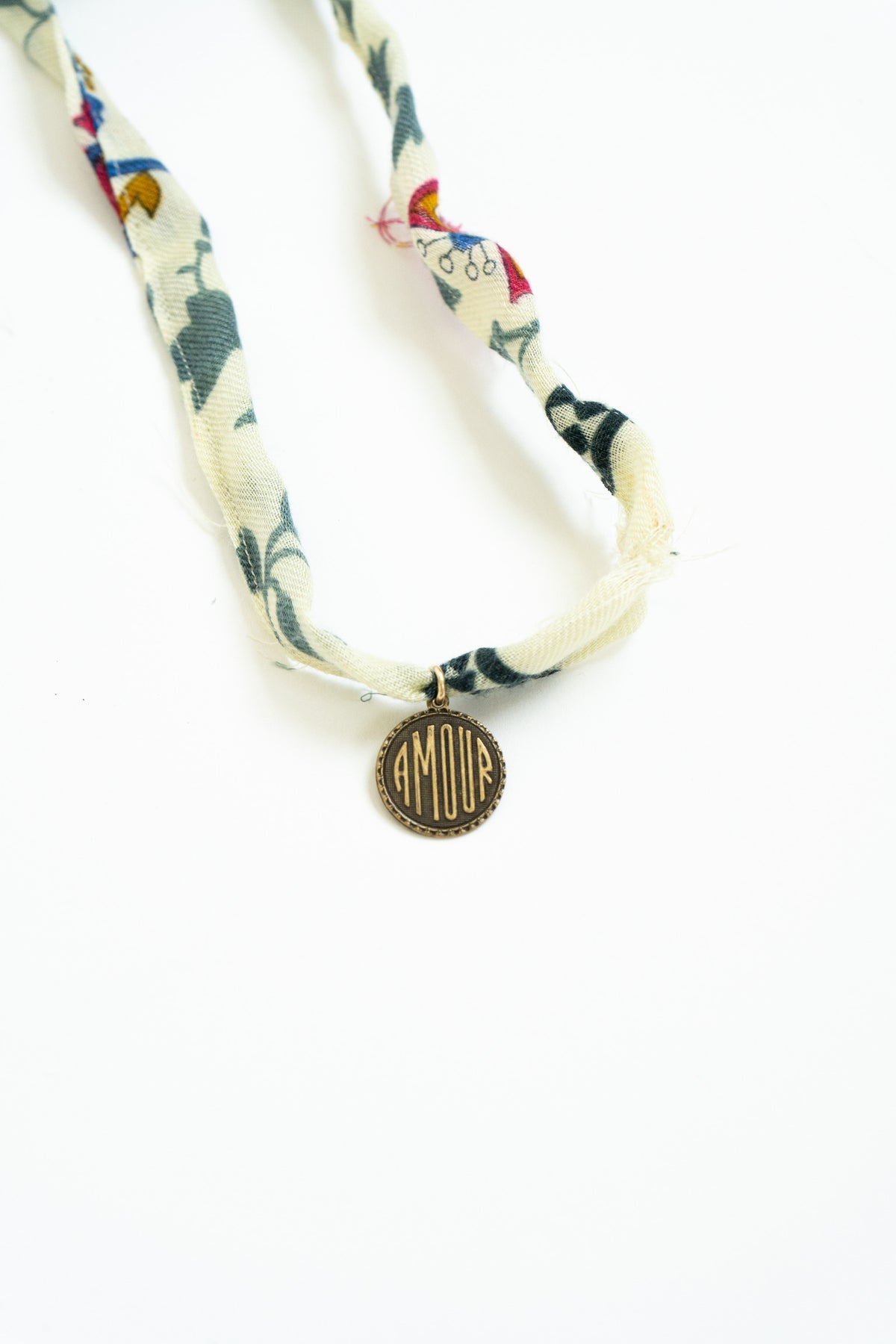 The Clara Necklace is crafted from vintage woven cotton blend fabric featuring a beautiful, colorful motif. Hand sewn into a long strip, this necklace offers versatile styling—wear it as a single strand, or double wrap it around your neck for a chic layered look. Adorned with a unique vintage Amor charm, it adds a charming, timeless touch to your outfit. Please avoid getting it wet to maintain its quality.